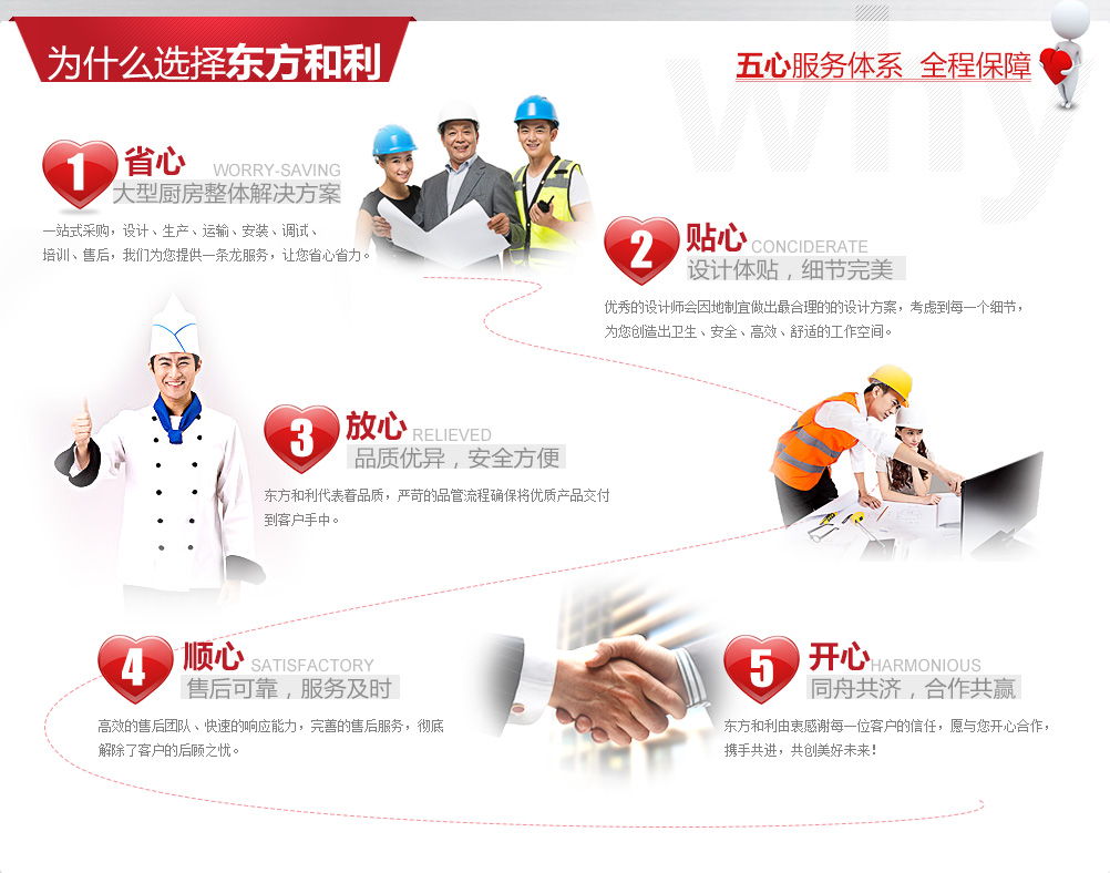 廚房工程建設(shè)是一項(xiàng)龐大復(fù)雜的系統(tǒng)工程,既需要與后勤工作人員、廚師溝通協(xié)調(diào), 又要與土建、裝修、機(jī)電、暖通等工程人員相互配合,工作量十分巨大。同時(shí)還要采購眾多的食品機(jī)械、工具,這對沒有相關(guān)經(jīng)驗(yàn)的我們來說確實(shí)是一個(gè)挑戰(zhàn)。有時(shí)候我們面對廚師提出的長長的采購需求清單就已經(jīng)眼花繚亂了。 幸好東方和利提供的是整體解決方案,從前期的設(shè)計(jì)咨詢到后期的安裝調(diào)試、從大型設(shè)備到餐具小件,包括各種食品機(jī)械,排煙通風(fēng),這些瑣碎事情都由東方和利來完成,為我們提供量身定制的解決方案。一站式采購為我們節(jié)省了大量精力,而且所有廚具都由東方和利來保修,對我們來說也更加方便??傊瑬|方和利的服務(wù)讓我們非常省心,我很滿意。